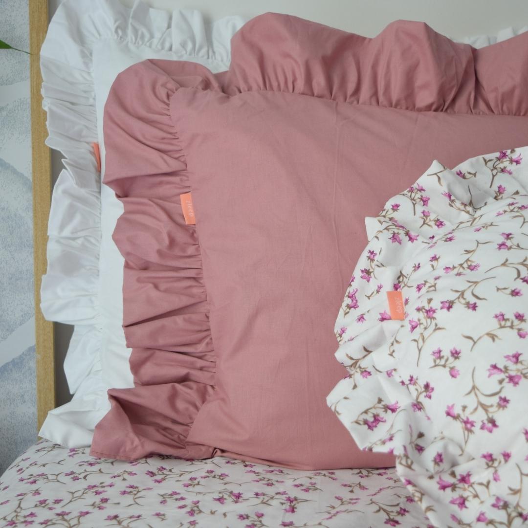 Το σχέδιο Φρου Φρου – Σάπιο Μήλο έχει έρθει για να ολοκληρώσει τη ρομαντική διακόσμηση στο υπνοδωμάτιό σας και να φέρει έναν αέρα άνοιξης. Για το σχέδιο αυτό χρησιμοποιούμε σεντονόπανο σε χρώμα σάπιο μήλο και περιμετρικά για το απόλυτο ρομάντζο έχουμε δημιουργήσει αυτό το τέλειο βολάν.Το σετ περιλαμβάνει δύο μαξιλαροθήκες με το σχέδιο Φρου Φρου – Σάπιο Μήλο. Συνδύασε τις μαξιλαροθήκες Φρου Φρου – Σάπιο Μήλο με ένα βαμβακερό σεντόνι της επιλογής σου.
