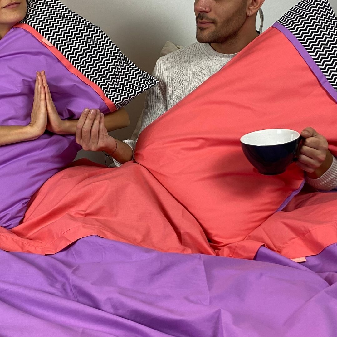 Μια double face Παπλωματοθήκη έχει έρθειγια να σας θυμίσει τη funky διάθεση μιας άλλης εποχής. Για το σχέδιο αυτό χρησιμοποιούμε σεντονόπανο χρώματος λεβάντα και σεντονόπανο χρώματος κοραλί.Να πούμε σε αυτό το σημείο πως υπάρχει φερμουάρ για να αφαιρείται και να πλένετε εύκολα. Μη ξεχάσεις να ολοκληρώσεις το σετ με τις μαξιλαροθήκες 80’s αλλά και ένα βαμβακερό σεντόνι της επιλογής σου.